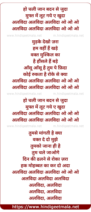 Lyrics of Alvida Alvida Alvida - हो चली जान बदन से जुदा