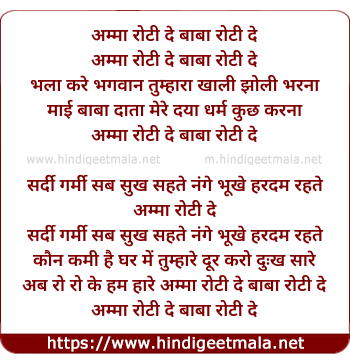 Lyrics of Amma Roti De Baba Roti De - अम्मा रोटी दे बाबा रोटी दे