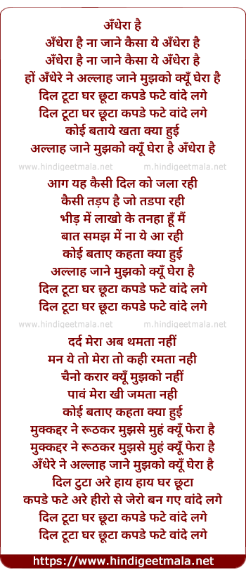 Lyrics of Andhera Hai Na Jaane Kaisa - अँधेरा है ना जाने कैसा