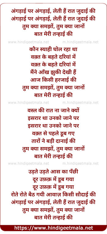 Lyrics of Angdai Per Angadi Leti Hai Raat - अंगड़ाई पर अंगड़ाई, लेती हैं रात जुदाई की
