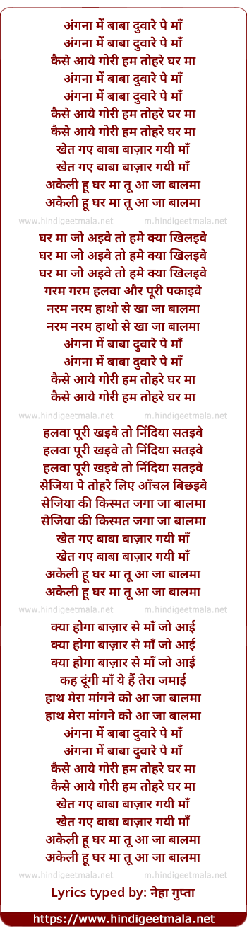 Poetic Translation - Lyrics of Angna Mein Baba Duare Pe Maa - अंगना में बाबा दुवारे पे माँ