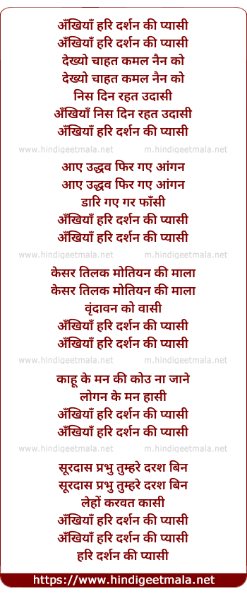 Lyrics of Ankhiya Haree Darshan Kee Pyasee - अँखियाँ हरि दर्शन की प्यासी