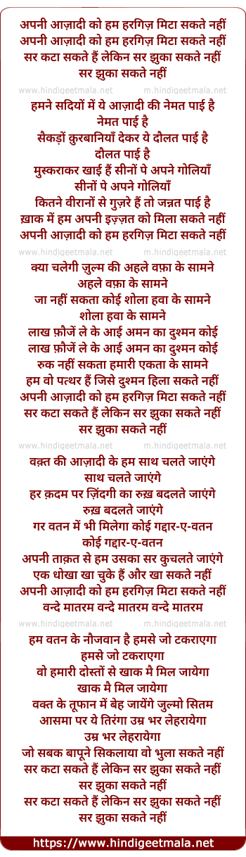 Lyrics of Apani Aazaadi Ko Ham Haragiz Mitaa Sakate Nahin - अपनी आज़ादी को हम हरगिज़ मिटा सकते नहीं