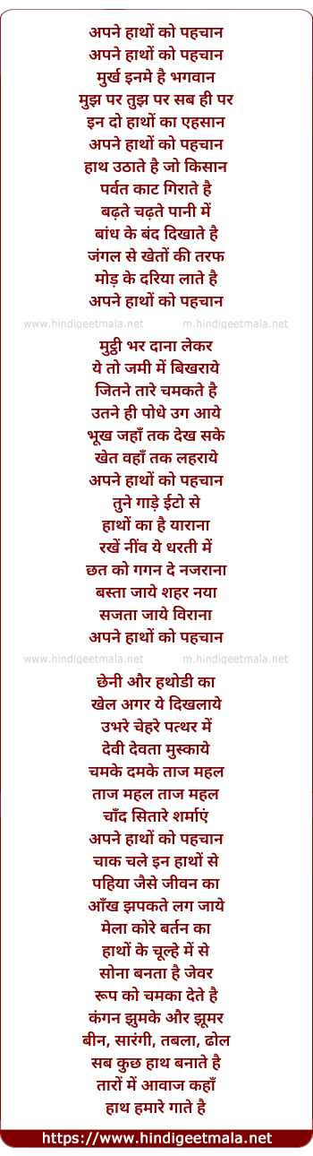 Lyrics of Apne Hatho Ko Pehchan - अपने हाथों को पहचान