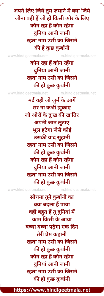 Lyrics of Apne Liye Jiye To Jamane Me Kya Jiya - अपने लिए जिये तो ज़माने में क्या जिये
