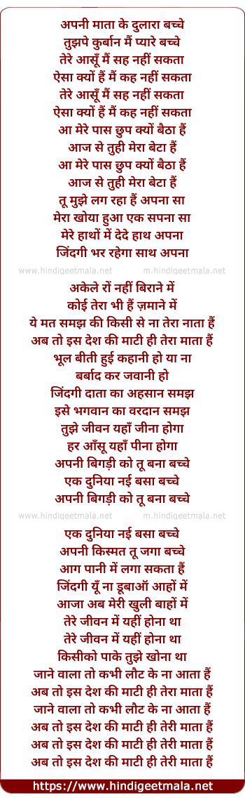Lyrics of Apni Mata Ke Dulare Bachhe - अपनी माता के दुलारा बच्चे