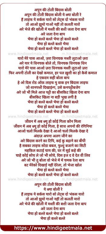 Lyrics of Apun Kee Toli Bindhast Boli - अपुन की टोली बिंदास बोली