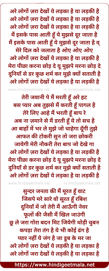 Lyrics of Are Logo Zara Dekho Ye Ladka Hai Ke Ladki Hai - अरे लोगों ज़रा देखों ये लड़का है के लड़की है