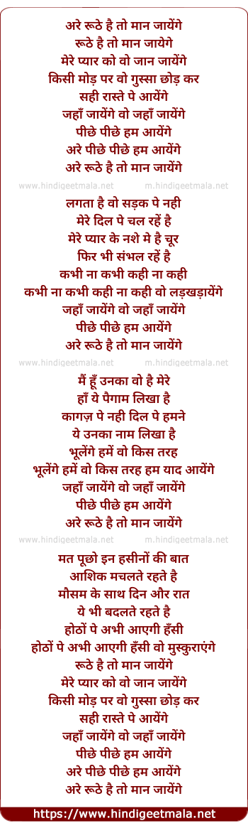 Lyrics of Are Roothe Hai To Maan Jaayenge - अरे रूठे है तो मान जायेंगे
