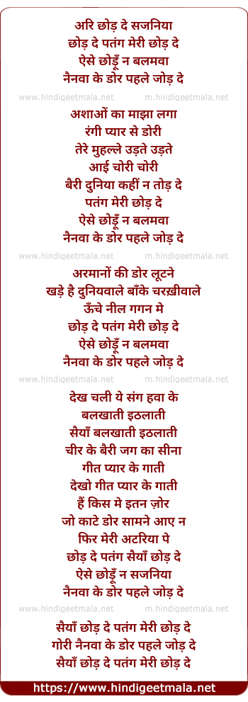 Lyrics of Ari Chhod De Sajaniyaa - अरी छोड़ दे सजनिया
