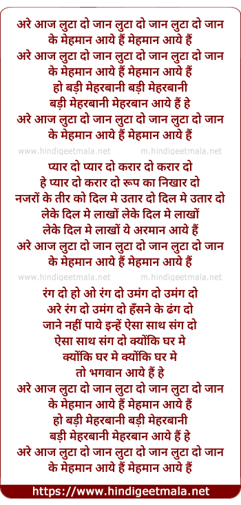 Lyrics of Arre Aaj Lutaa Do Jaan - अरे आज लुटा दो जान