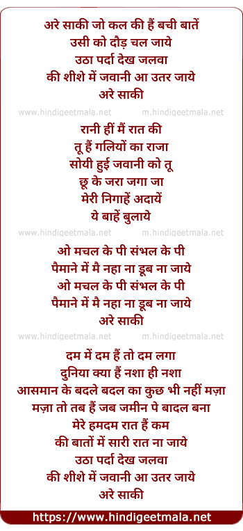 Lyrics of Aur Saqi Jo Kal Ko Hai Bachi - अरे साकी जो कल की हैं बची