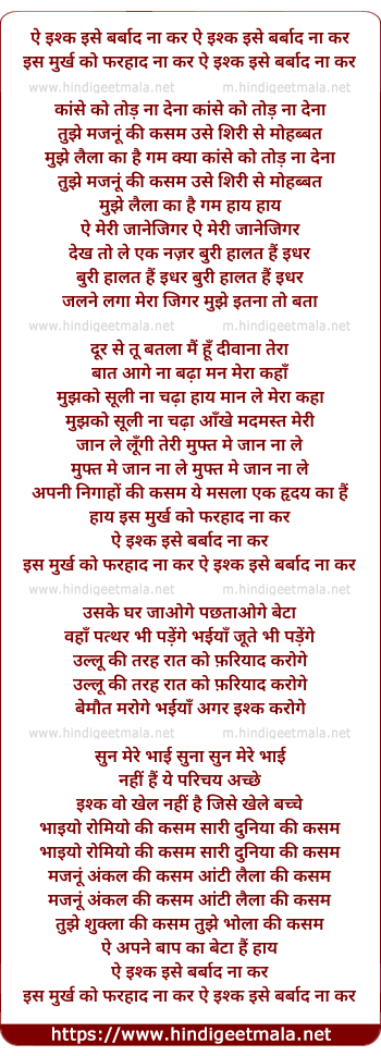 Lyrics of Ae Ishq Ise Barbad Naa Kar - ऐ इश्क इसे बर्बाद ना कर