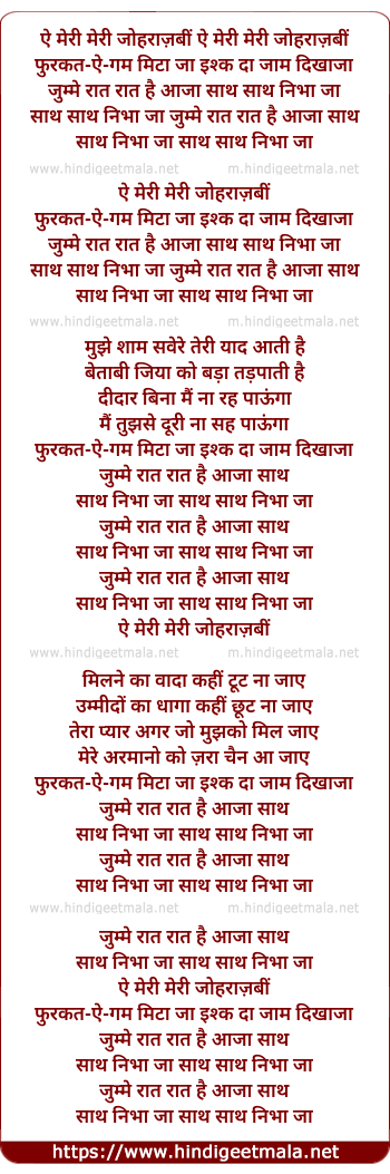 Lyrics of Ae Meri Meri Johraajabi - ऐ मेरी मेरी जोहराज़बीं