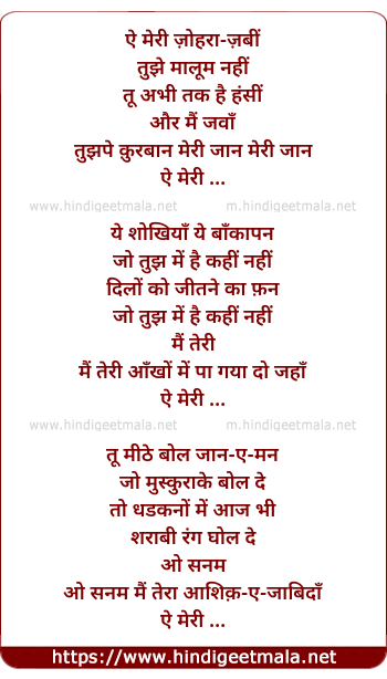 Lyrics of Aye Meri Zohra Zabeen, Tujhe Malum Nahi - ऐ मेरी ज़ोहरा ज़बीं, तुझे मालूम नहीं
