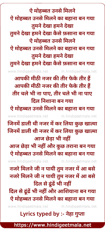 Lyrics of Ae Mohabbat Unse Milne Ka Bahana Ban Gaya - ऐ मोहब्बत उनसे मिलने का बहाना बन गया