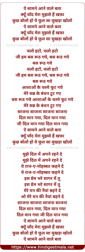 Lyrics of Aye Samne Aane Wale Bata - ऐ सामने आने वाले बता