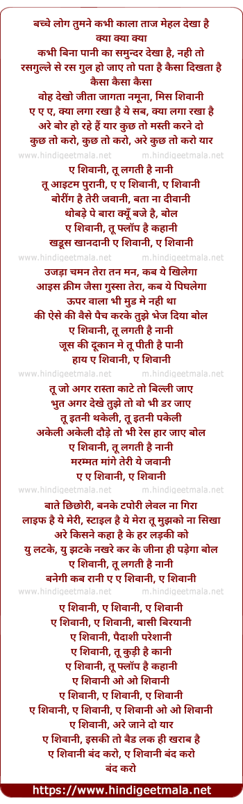 Lyrics of Aye Shivani, Too Lagatee Hai Nanee - ऐ शिवानी, तू लगती है नानी