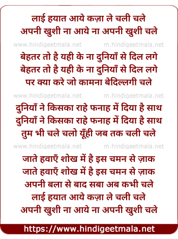 Lyrics of Layi Hayat Aye Kaza Le Chali Chale - लाई हयात आये कज़ा ले चली चले