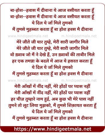 Lyrics of Ba Hosh O Havaas Main Divaanaa - बा होश ओ हवास मैं दीवाना