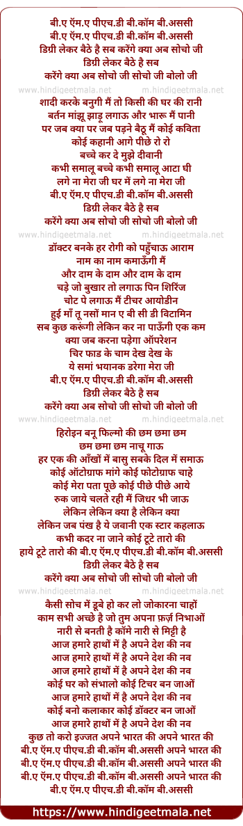 Lyrics of Ba Ma Bed Bt Bcom Bsc, Degree Lekar Baithe Hai Sab - बी.ए ऍम.ए पीएच.डी बी.कॉम बी.अससी, डिग्री लेकर बैठे है सब