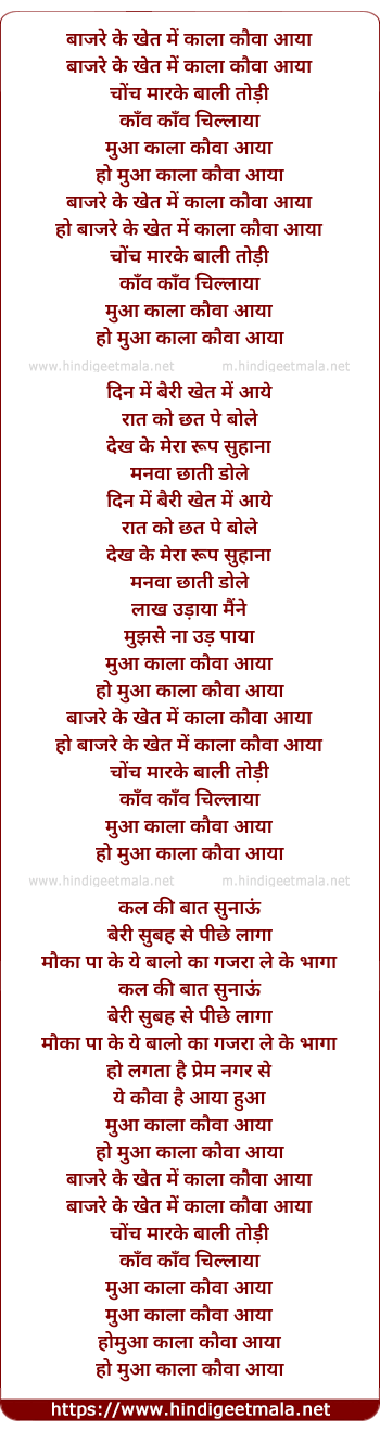 Lyrics of Baajre Ke Khet Me Kala Kauva Aaya - बाजरे के खेत में काला कौवा आया