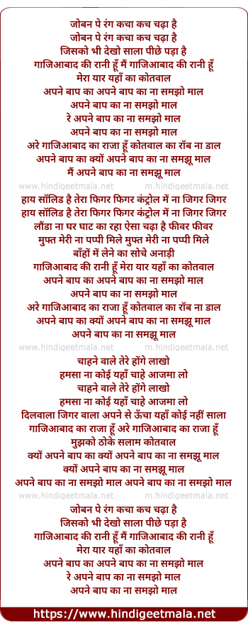 Lyrics of Baap Ka Maal (Remix) - जोबन पे रंग कचा कच चढ़ा है