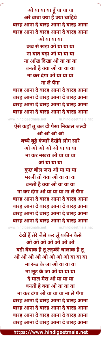 Lyrics of Bara Aana De, Kabse Khadaa - बारह आना दे, कबसे खड़ा