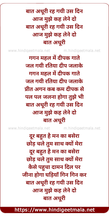 Lyrics of Baat Adhuri Rah Gayi Us Din - बात अधूरी रह गयी उस दिन