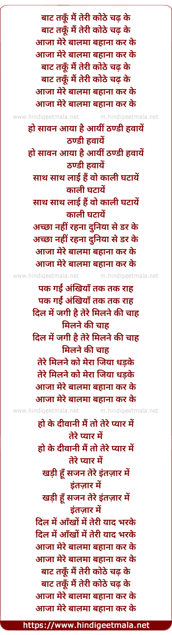 Lyrics of Baat Taku Mai Teri Kothe Chadh Ke (Aaja Mere Balma Bahana Kar Ke) - बाट तकूँ मैं तेरी कोठे चढ़ के