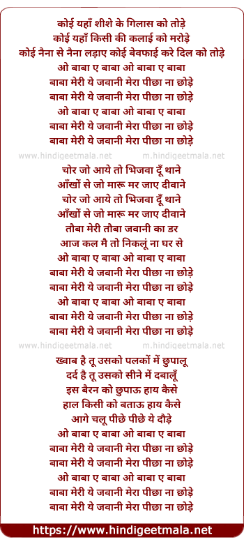 Lyrics of Meri Ye Jawani Mera Picha Na Chode - मेरी ये जवानी मेरा पीछा ना छोड़े