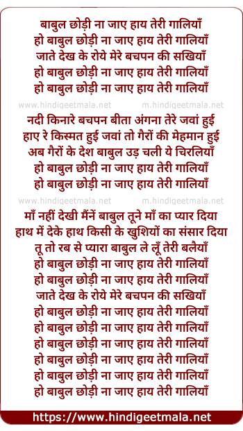 Lyrics of Babul Chhodi Na Jaye Teri Galiya - बाबुल छोड़ी ना जाए तेरी गालियाँ
