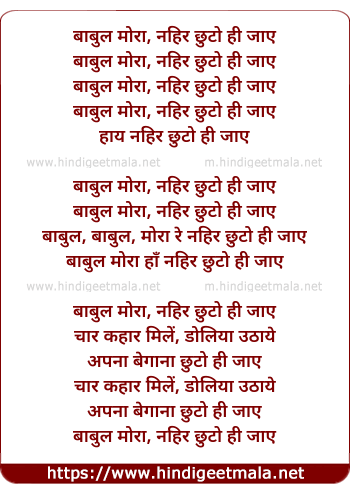 Lyrics of Babul Mora - बाबुल मोरा, नहिर छुटो ही जाए