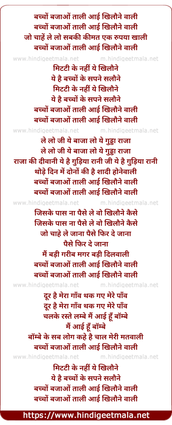 Lyrics of Baccho Bajao Tali Aayi Khilone Wali - बच्चों बजाओं ताली आई खिलौने वाली