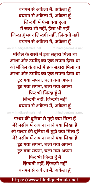 Lyrics of Bachpan Se Akelaa - बचपन से अकेला मैं, अकेला हूँ