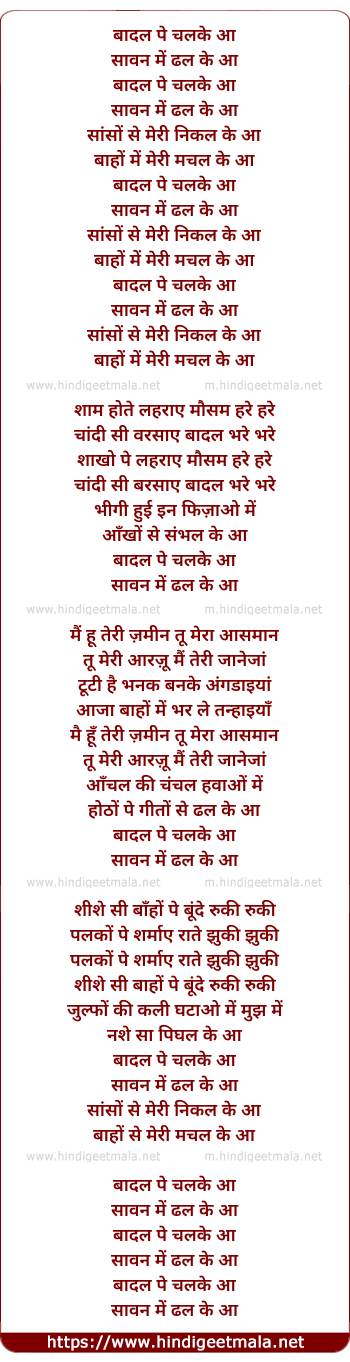 Lyrics of Badal Pe Chalke Aa - बादल पे चलके आ