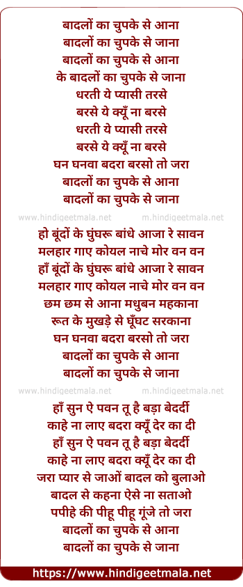 Lyrics of Badalo Ka - बादलों का चुपके से आना