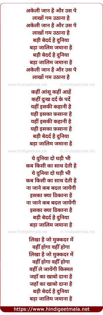 Lyrics of Badi Bedard Hai Duniya - अकेली जान है और उस पे