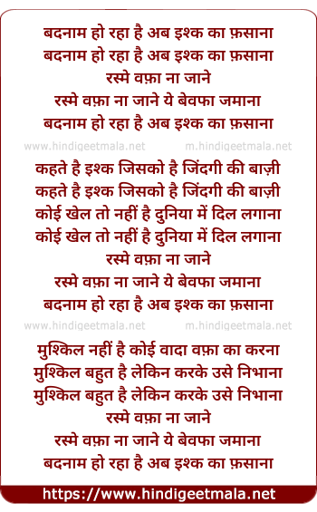 Lyrics of Badnaam Ho Raha Hai Ab Ishq Ka Fasana - बदनाम हो रहा है अब इश्क का फ़साना