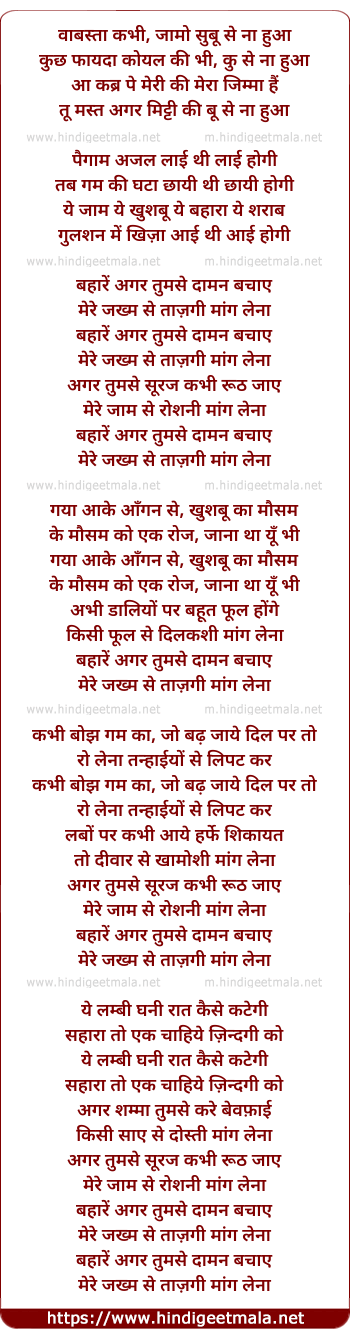 Lyrics of Bahaare Agar Tumse Daaman Bachaaye - वाबस्ता कभी, जामो सुबू से ना हुआ