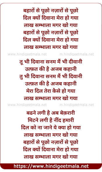Lyrics of Baharo Se Puchho Najaro Se Puchho - बहारों से पूछो नज़ारों से पूछो