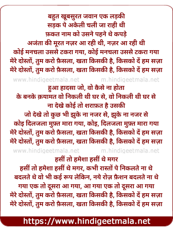 Lyrics of Bahut Khubsurat Javaan Ek Ladki - बहुत खूबसुरत जवान एक लड़की