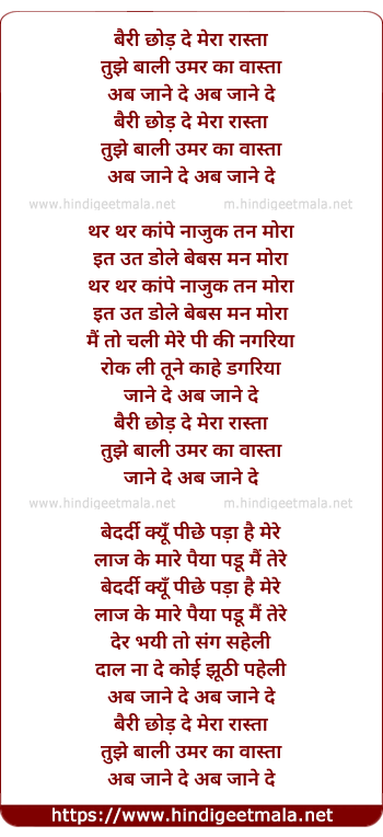 Lyrics of Bairi Chod De Mera Rasta - बैरी छोड़ दे मेरा रास्ता