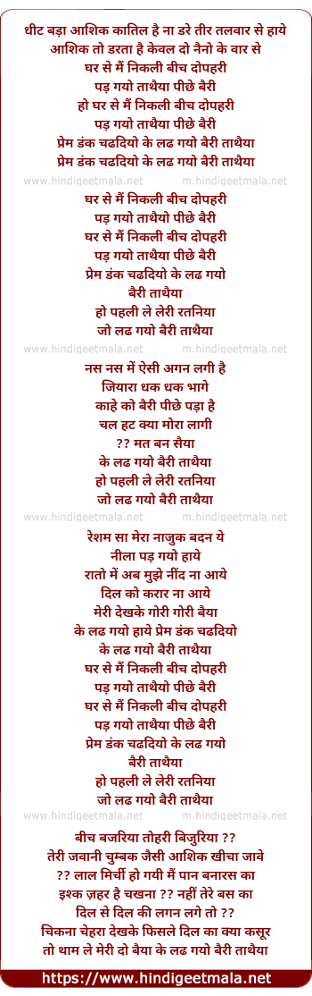 Lyrics of Bairi Tathaiya, Ghar Se Main Nikli - धीट बड़ा आशिक कातिल है ना डरे तीर तलवार से हाये