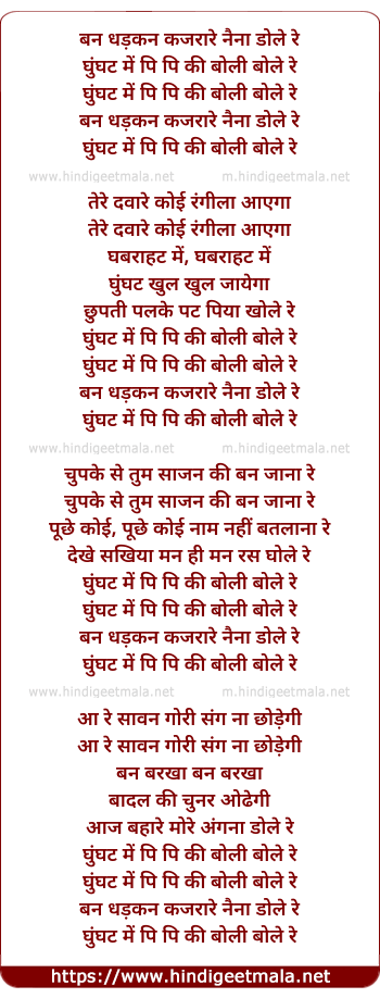 Lyrics of Ban Dhadkan Kajrare Naina Dole Re - बन धड़कन कजरारे नैना डोले रे