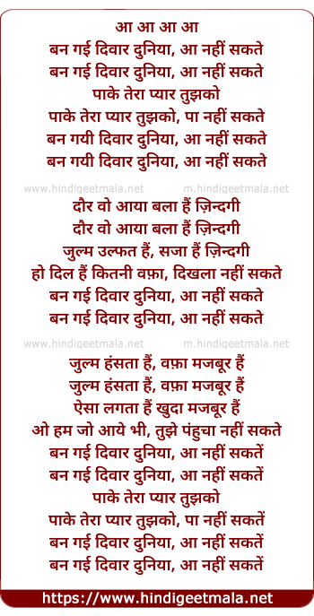 Lyrics of Ban Gayi Diwar Duniya - बन गई दिवार दुनिया