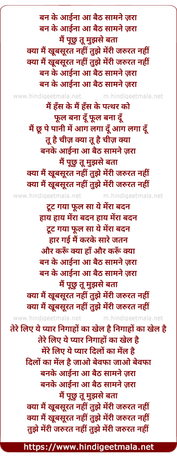 Lyrics of Ban Ke Aaina Aa - बन के आईना आ