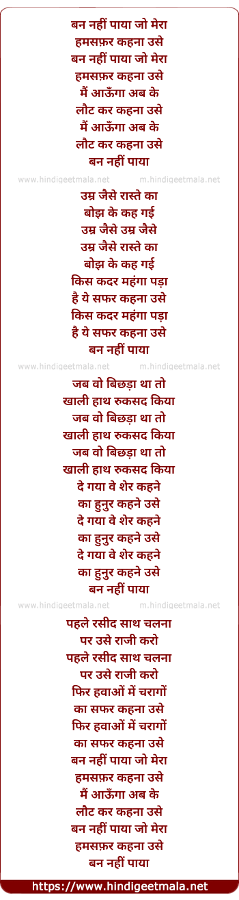 Lyrics of Ban Nahi Paya Jo Mera Humsafar - बन नहीं पाया जो मेरा हमसफ़र