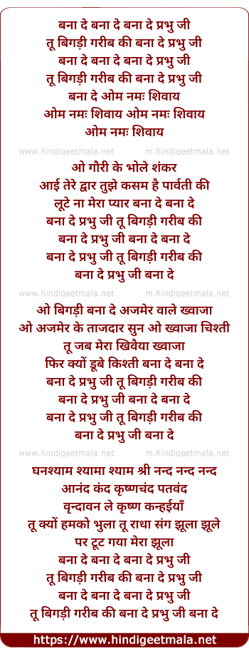 Lyrics of Bana De Bana De Bana De Prabhu Ji - बना दे बना दे बना दे प्रभु जी