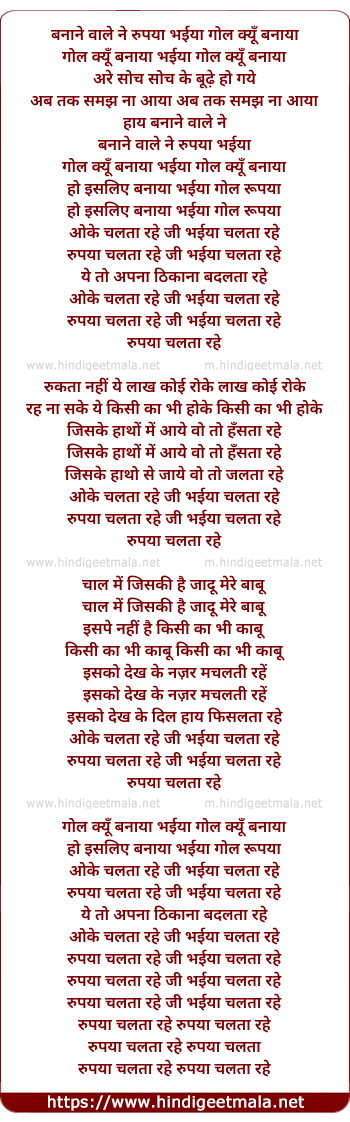 Lyrics of Bananewale Ne Rupaiya Bhaiya Gol Kyu Banaya - बनाने वाले ने रुपैया भैया गोल क्यूँ बनाया